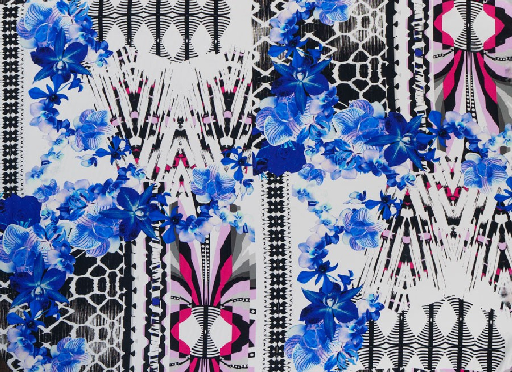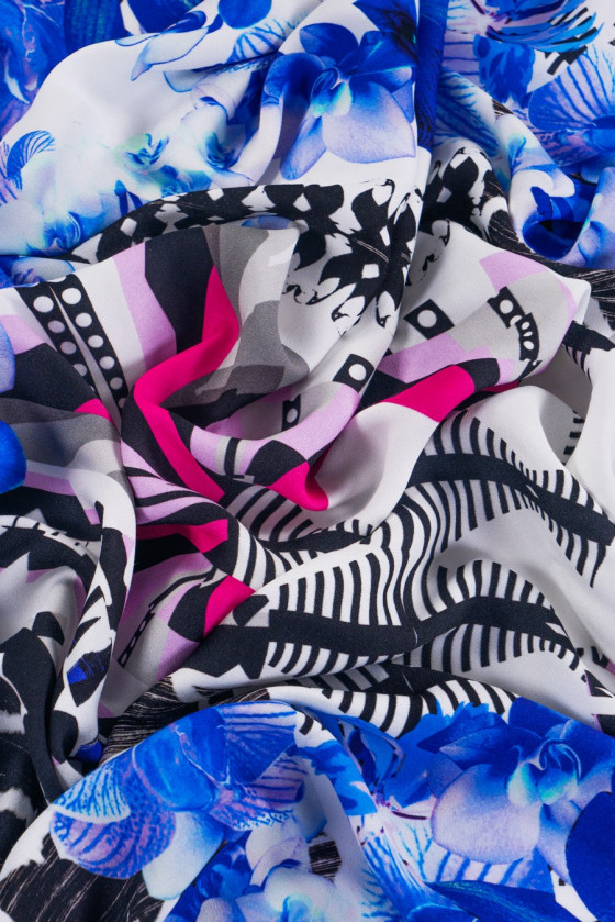 Talianska látka 100% viskóza s väzbou georgette. Zaujímavý motív kvetov a geometrických vzorov na bielom pozadí. Mäkká, splývavá, neelastická tkanina - ideálna na šitie šiat, sukne, blúzky.