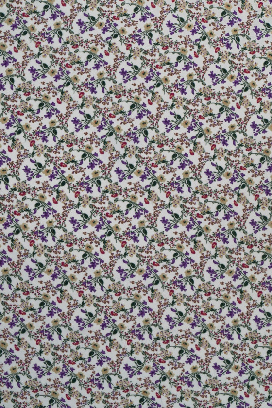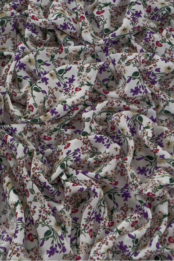Talianska tkanina 100% viskóza s malými, farebnými kvetmi na ecru pozadí. Mäkká, splývavá, tenká, ale nepriehľadná tkanina - ideálna na šitie blúzky, šiat, sukne.