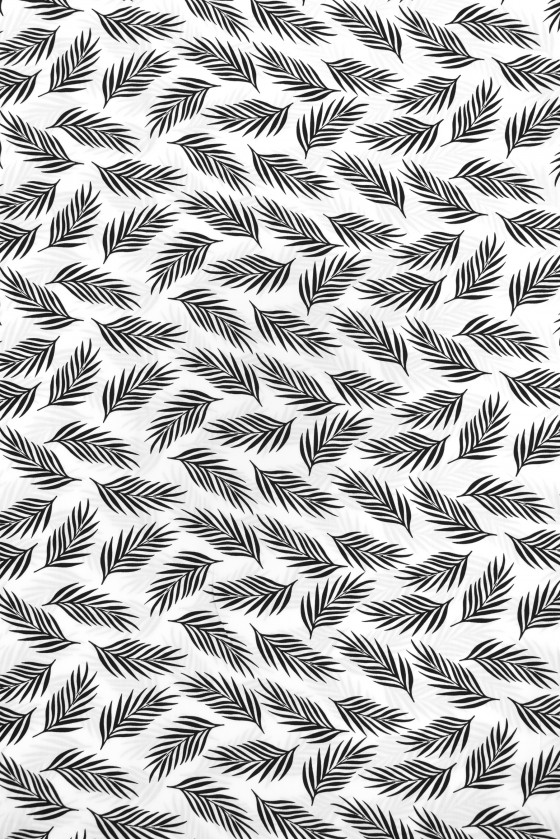 Talianska, neelastická látka 100% viskóza v bielej farbe s motívom čierneho listu. Mäkká, splývavá, tenká, ale nepriehľadná tkanina - ideálna na šitie letných šiat, blúzky, sukne.