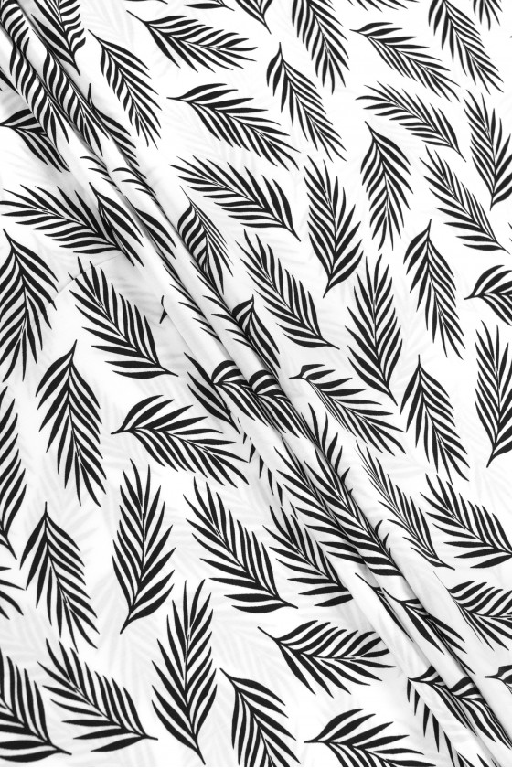 Talianska, neelastická látka 100% viskóza v bielej farbe s motívom čierneho listu. Tkanina je mäkká, splývavá, tenká, ale nepriehľadná.