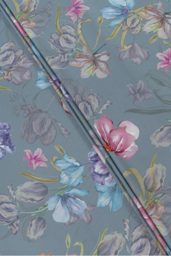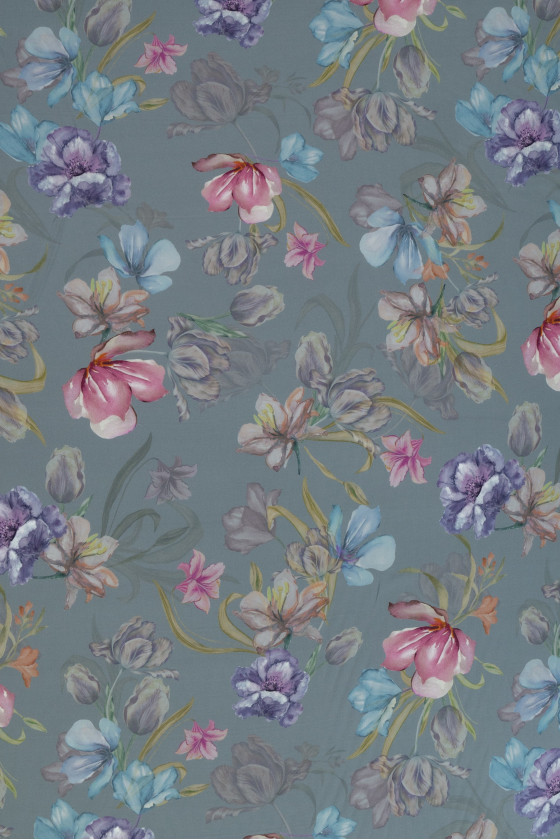 Talianska 100% viskózová tkanina v šedo-modrej farbe s motívom maľovaných kvetov v modrej, fialovej a ružovej farbe. Viskóza je tkanina získaná z celulózy, veľmi priedušná a mäkká, je šetrná k pokožke (nealergénna) a dokonale absorbuje vlhkosť.