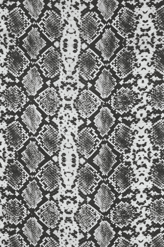Talianska 100% viskózová tkanina s motívom čiernej a šedej hadej kože. Viskóza je tkanina získaná z celulózy, veľmi priedušná a mäkká, je šetrná k pokožke (nealergénna) a dokonale absorbuje vlhkosť.