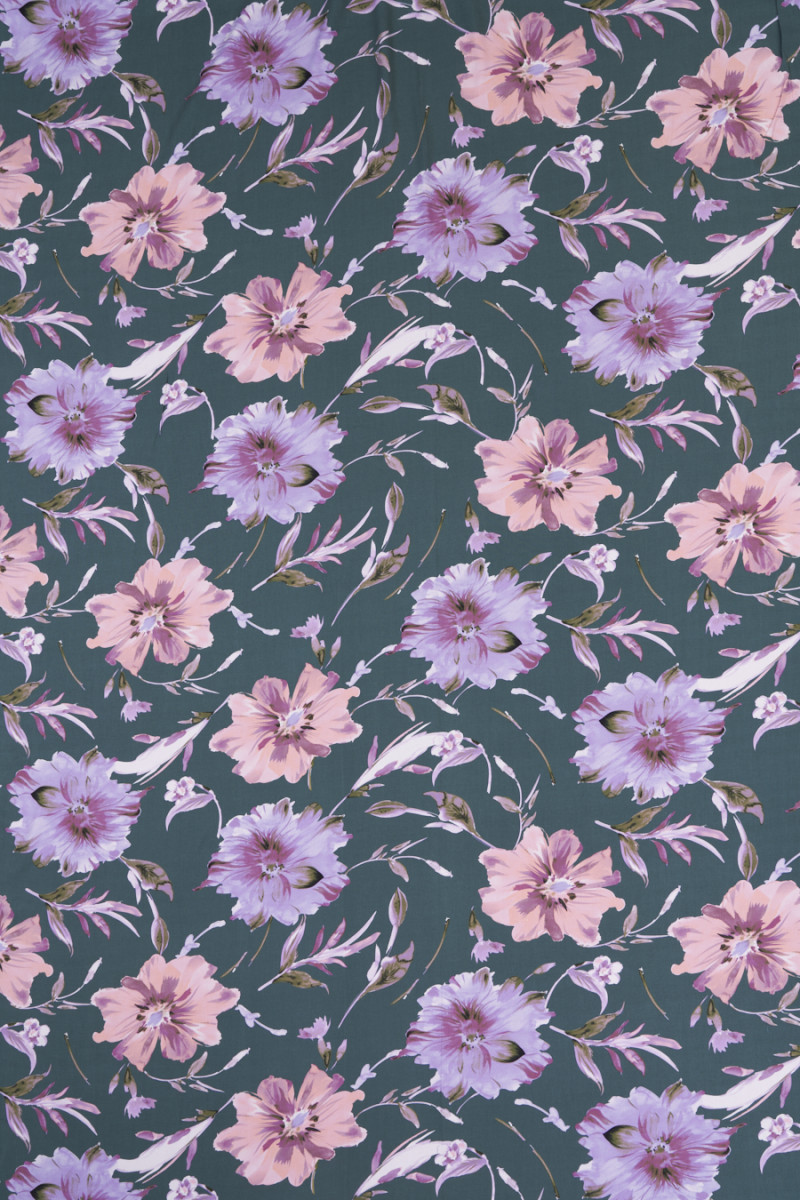 Talianska 100% viskózová tkanina v tmavej, tlmenej zelenej farbe s motívom veľkých kvetov (cca 25 cm) vo vresovej a lososovej farbe, kvety majú fialovú a zelenú výplň, vďaka tejto úprave nebol vzor plochý a výraznejší. Kvetinové motívy obklopujú menšie listy a vetvičky, vďaka čomu je hustý. Látka má jemnú keprovú väzbu, je neelastická, veľmi mäkká a príjemná na dotyk. Krásna ponuka pre ľudí, ktorí majú radi kvetinové vzory v jemných, tlmených farbách.