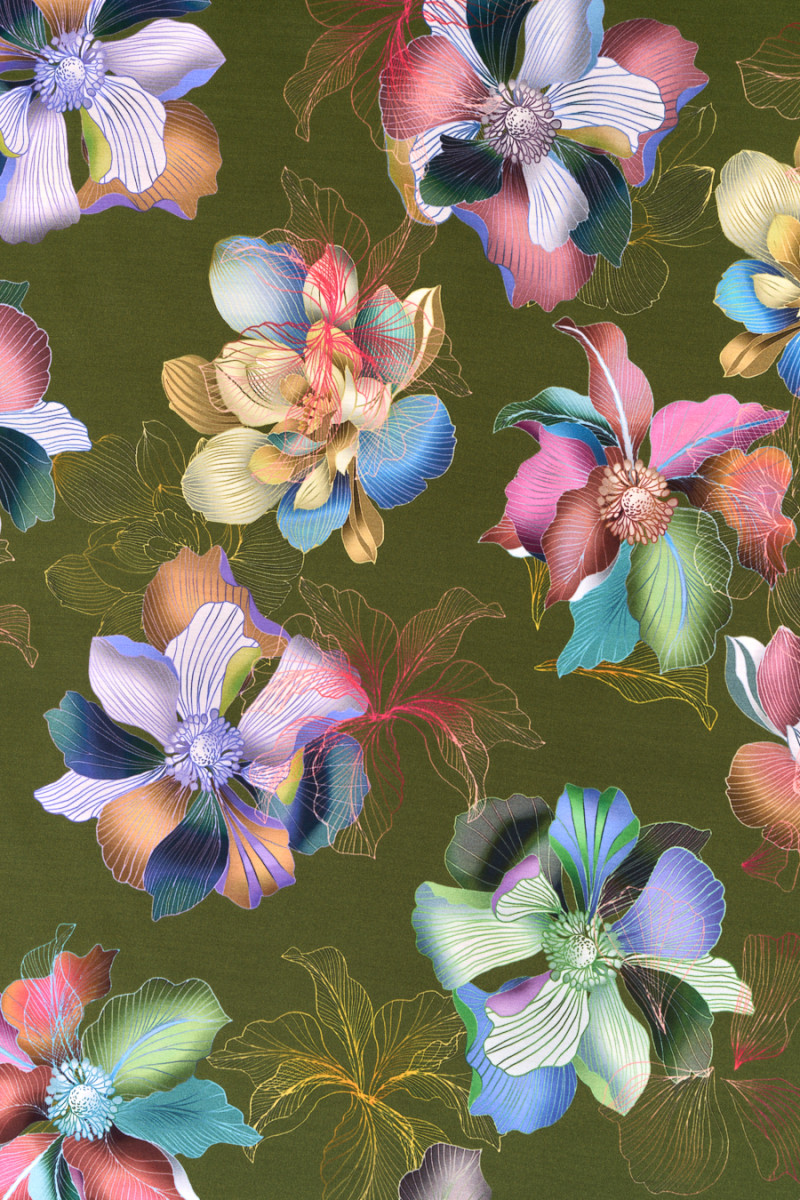 Taliansky viskózový satén s motívom farebných, veľkých kvetov na zelenom pozadí. Husto umiestnený kvetinový vzor vyrobený v jesenných farbách, kvety 14 cm * 15 cm. Látka je neelastická, splývavá, jemná na dotyk, mäkká a krásne sedí. Fantastický návrh pre ľudí, ktorí hľadajú jedinečné a zaujímavé materiály na košele, sukne, šaty alebo šatky.