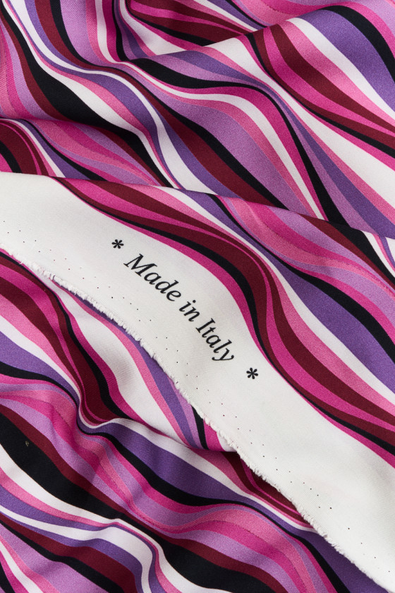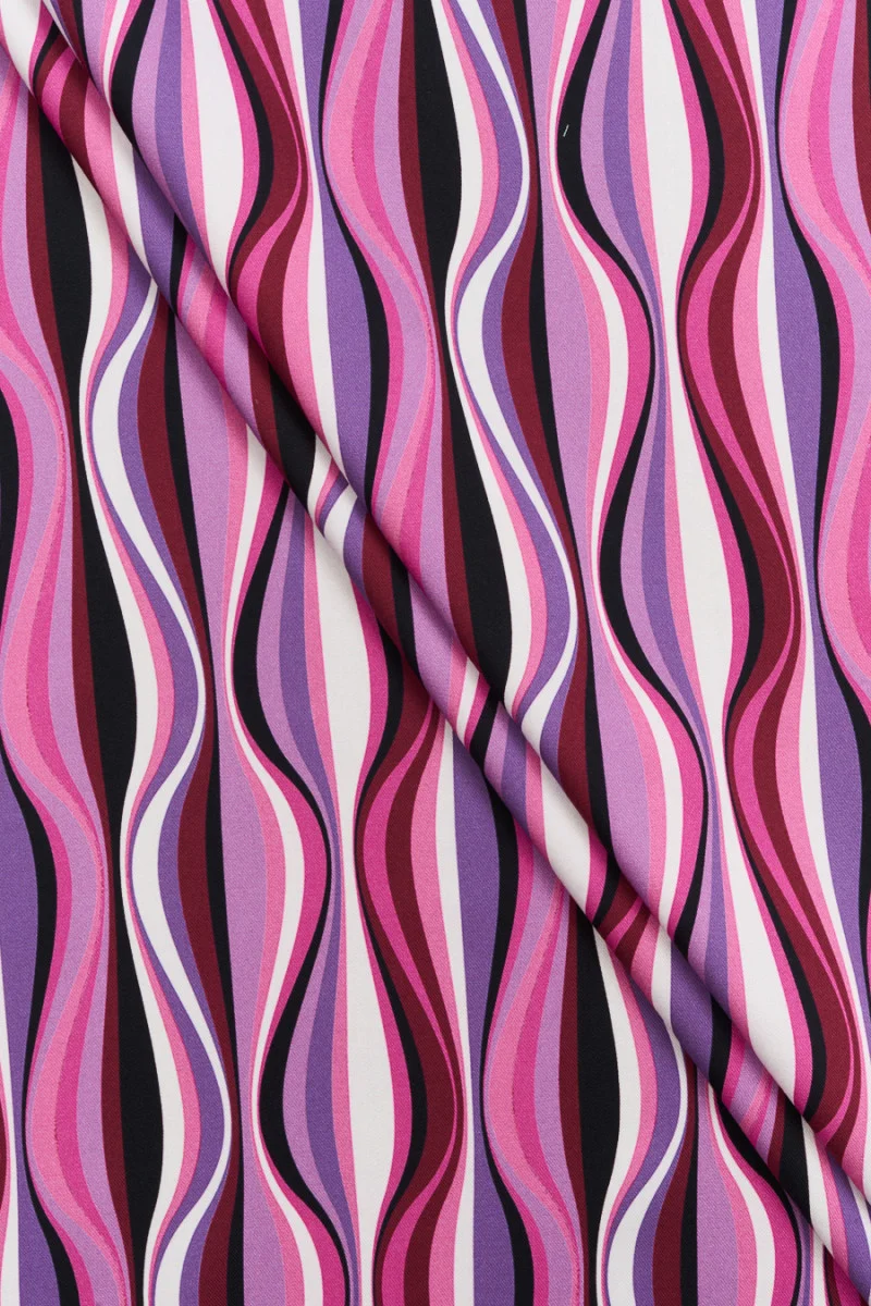 Talianska tkanina 100% viskóza s vlnovým vzorom v ružovej, fialovej, krémovej a čiernej farbe. Látka je mäkká, matná, splývavá, nepriehľadná a veľmi príjemná na dotyk. Farebný návrh, z ktorého si môžete ušiť šaty, sukňu, blúzku alebo šortky.