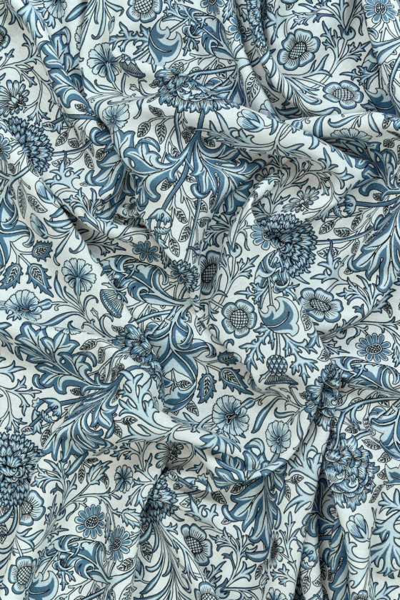 Talianska tkanina zo zmesi viskózy a ľanu s hustým kvetinovým motívom v modrošedej farbe na krémovom podklade. Látka je ľahká, mäkká, neelastická, nepriehľadná a vo väzbe vyzerá ako ľan. Romantický návrh ideálny pre letné oblečenie, ideálny pre košele, sukne, šaty.