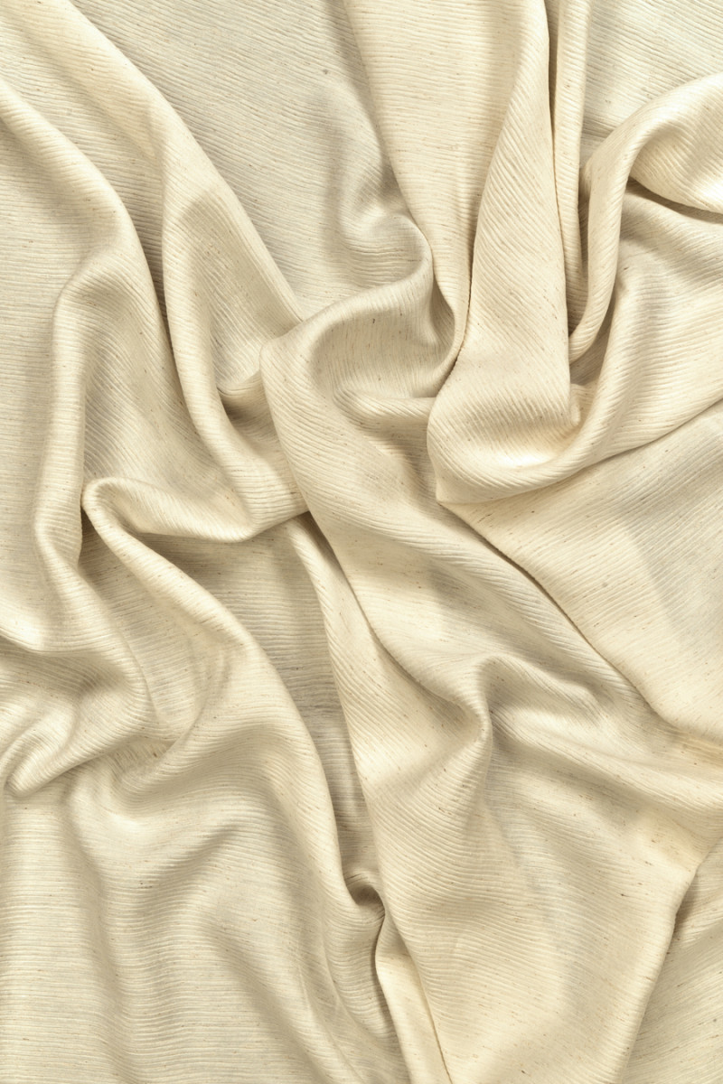 Originálna viskózová tkanina s prídavkom ľanu a polyamidu v melanžovej ecru a béžovej farbe. Tkanina s vlnitou textúrou (nepravidelný, tenký záhyb) a jemnou žiarou.