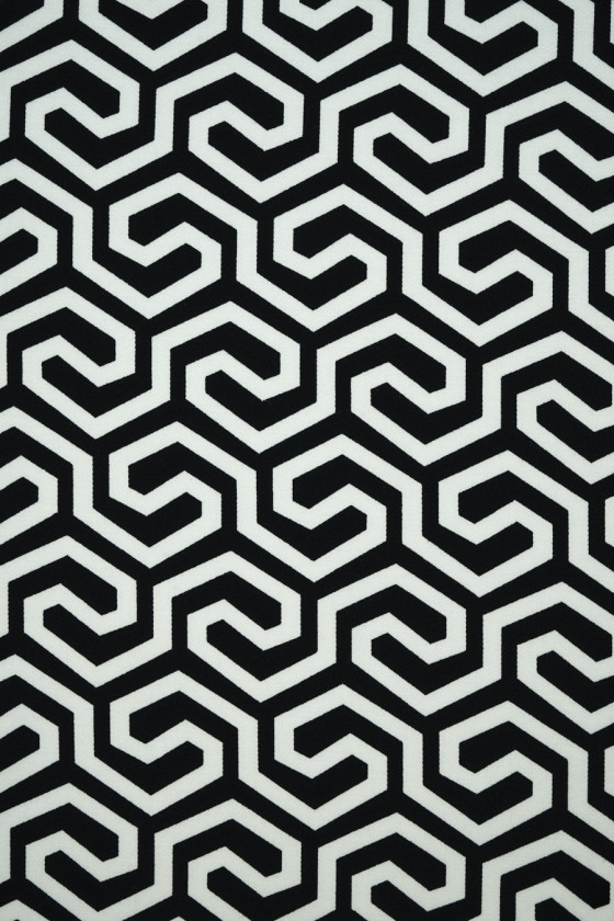 Talianska látka 100% viskóza s geometrickým motívom v ecru a čiernej farbe. Hustý, pravidelný vzor pripomínajúci voštiny. Látka je splývavá, príjemná na úchop, tenká, ale nepriehľadná a nepružná. Nadčasová ponuka, ktorá bude dobre fungovať na vzdušných šatách, sukniach, ale aj blúzkach a košeliach.