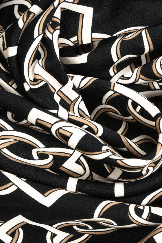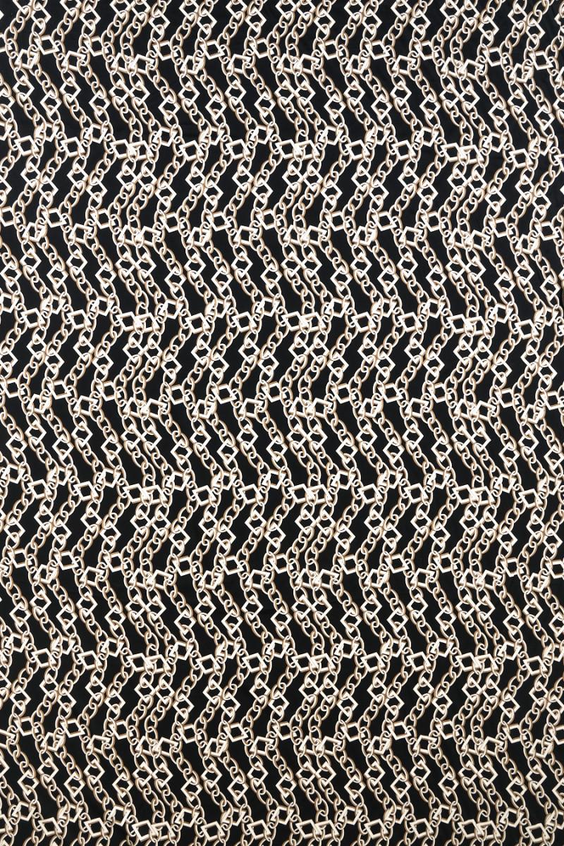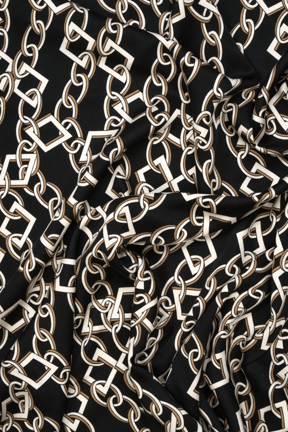 Talianska látka 100% viskóza s motívom retiazky na čiernom pozadí. Hustý a pravidelný vzor vyrobený v krémovej a béžovej farbe, jedna retiazka je široká asi 2,5 cm. Látka je splývavá, mäkká, príjemná na dotyk, tenká, ale nepriehľadná a neelastická. Zaujímavá ponuka pre ľudí, ktorí majú radi látky s charakterom. Je ideálny na šitie vzdušných šiat, sukní, ale aj blúzok a košieľ.