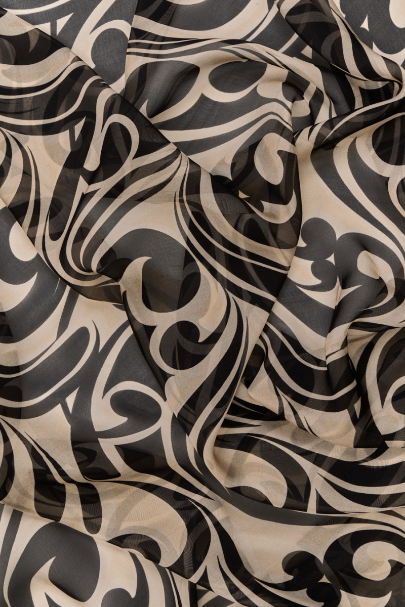 Taliansky viskózový šifón s prímesou prírodného hodvábu v čiernej farbe. Veľmi zaujímavý motív veľkých, vlnitých vzorov v svetlobéžovej farbe. Tkanina pozdĺž oboch okrajov je zakončená ozdobnými okrajmi širokými 15 cm a 25 cm - po obvode ju šijeme. Látka je tenká, priehľadná, ľahká a vzdušná, jemne sedí, takže je ideálna na šitie letných šiat, blúzky alebo šálu. Fantastická ponuka pre fanúšikov originálnych, prírodných látok.