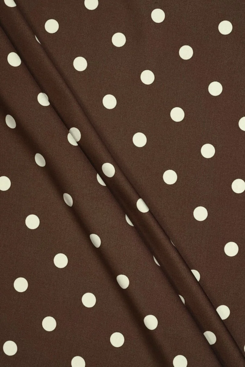 Talianska 100% viskózna látka v hnedej farbe s bodkovaným motívom v écru farbe. Vzor je usporiadaný pravidelne a má veľkosť 1,4 cm. Látka je tenká, ale nepriehľadná, neelastická, mäkká a splývavá. Bude skvelá na šitie letných šiat, sukne, blúzky alebo širokých nohavíc. Dokonalá látka pre ľudí, ktorí majú radi nadčasové vzory v pokojných farbách. Látka v štýle "PRETTY WOMEN".