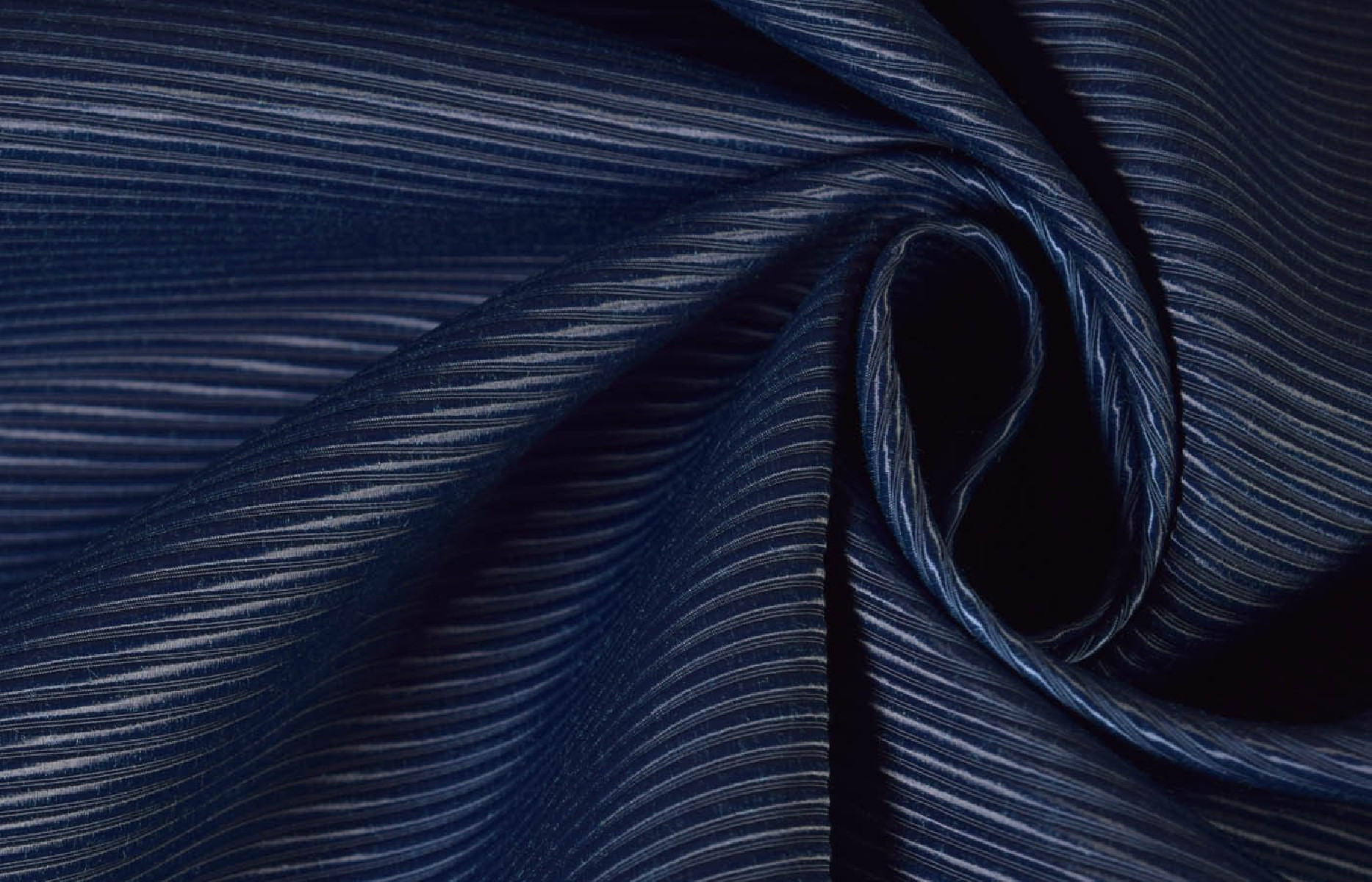 Látka s charakteristickým hrubým zrnom v námorníckej modrej. Tkanina je neelastická, mierne tuhá, s jemným leskom, hladká na dotyk. Ideálne pre tenké kabáty, bundy, zametacie sukne.