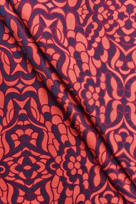 Talianska žakárová kostýmová tkanina s efektnými vzormi v tmavej námorníckej modrej a oranžovej farbe s bordovými okrajmi. Tkanina je mäsitá, neelastická, mierne tuhá. Zaujímavý návrh na šitie jedinečnej bundy alebo šiat.
