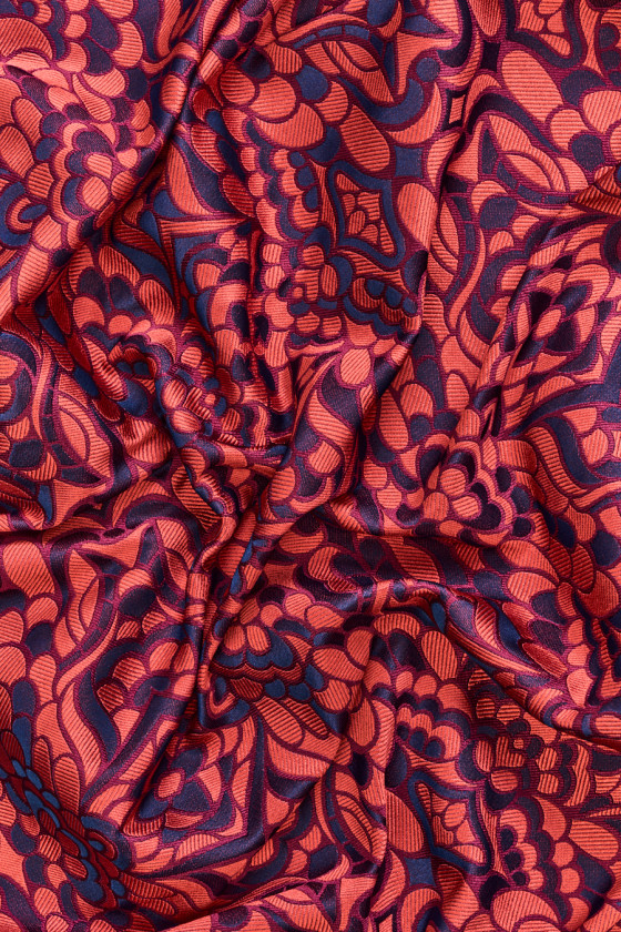 Talianska žakárová kostýmová tkanina s efektnými vzormi v tmavej námorníckej modrej a oranžovej farbe s bordovými okrajmi. Tkanina je mäsitá, neelastická, mierne tuhá. Zaujímavý návrh na šitie jedinečnej bundy alebo kabáta.