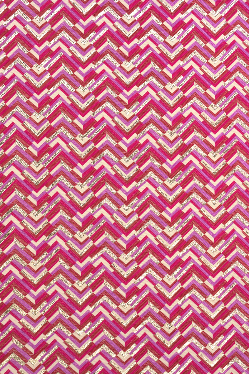 Talianska žakárová kostýmová látka s motívom farebných cikcakov. Látka je udržiavaná v ružovej, fialovej a béžovej farbe a je navyše zdobená zlatou lurexovou niťou, ktorá jej dodáva eleganciu. Materiál má mierne konvexnú štruktúru, je mäkký, stredne hrubý, nepriehľadný. Krásny návrh na šitie šiat, sukne a saka na špeciálne príležitosti.