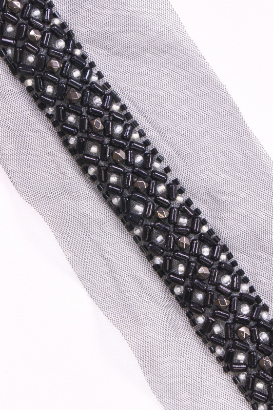 Talianska galantéria páska v čiernej farbe, široká 2,5 cm, bohato zdobená korálkami. Páska je vyrobená z troch typov korálkov: čiernej, tmavej grafitovej a bielej. Celok je prišitý na čiernej tylovej sieťovine. Krásna ponuka na ozdobenie elegantných šiat, blúzky alebo sukne.