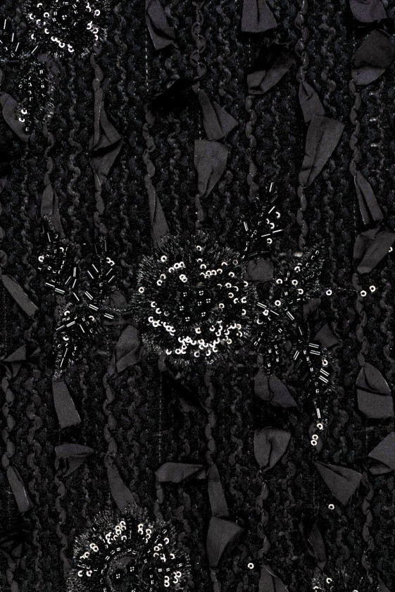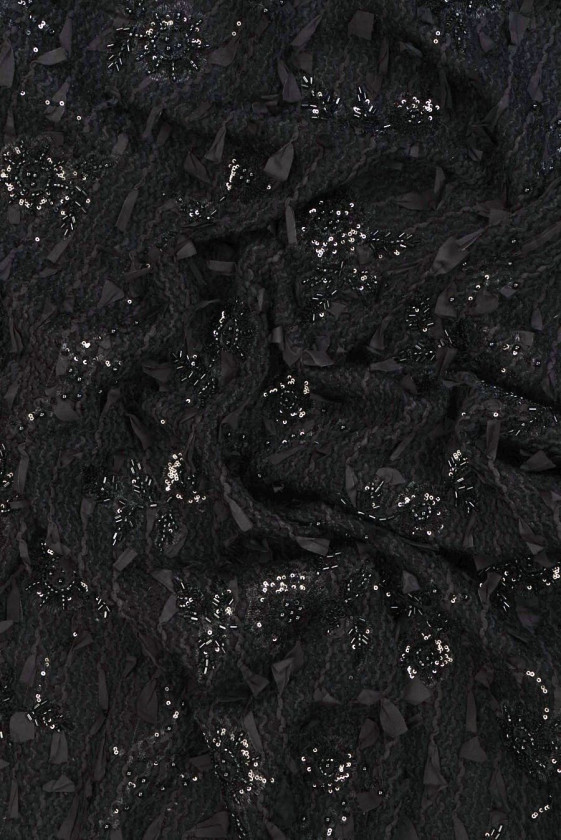 Talianska, exkluzívna látka pripomínajúca vo väzbe čierne bucles. Látka má husto tkané čierne stuhy, ktoré vyčnievajú 2,5 cm a vyšívané čierne kvety, husto zdobené čiernymi flitrami a korálkami. Látka je neelastická, voľne tkaná, jemne prehodená, s jasnou štruktúrou. Zaujímavá ponuka, z ktorej môžete vytvoriť šaty, sukne, ale aj elegantné vrchné oblečenie, ako sú peleríny, vesty.