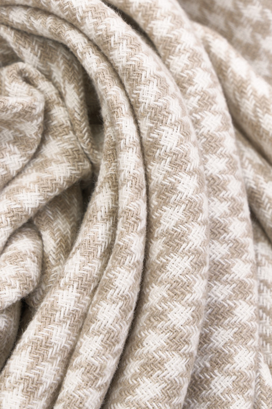 Talianska bavlnená tkanina s ľanom a polyesterom s malým motívom kuracej nohy v béžovej a smotanovej farbe. Tkanina je mäsitá, neelastická, s mierne voľnou väzbou, ale úplne nepriehľadná. Klasický návrh na nohavice, bundy, šaty, sukne a šortky.