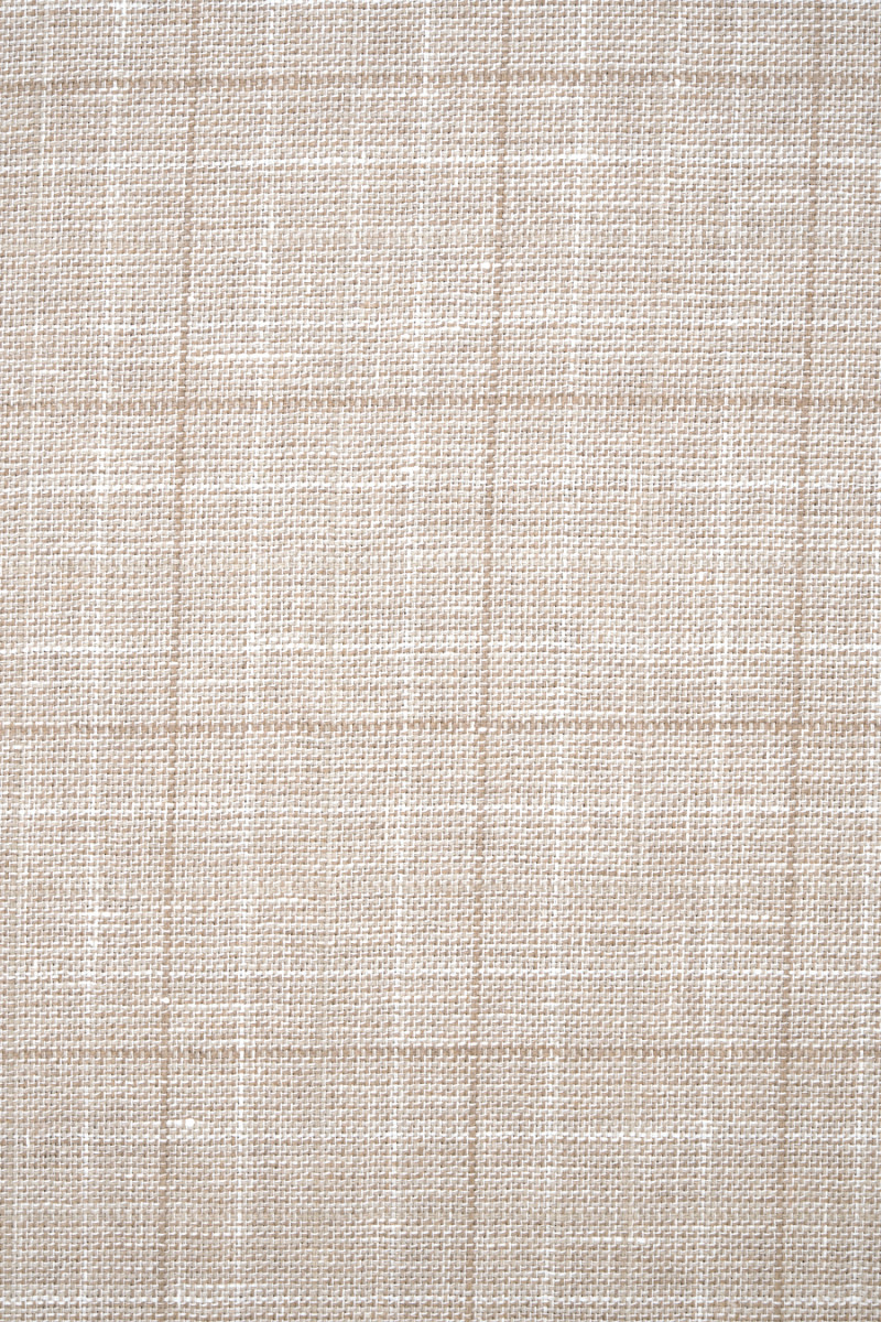 Talianska látka zmes ľanu, polyesteru, vlny a viskózy s jemným károvaným motívom v béžových odtieňoch. Tkanina je tenká, neelastická, s mierne voľnou väzbou, ale dobre kryje. Klasický návrh na nohavice, bundy, šaty, sukne a šortky.