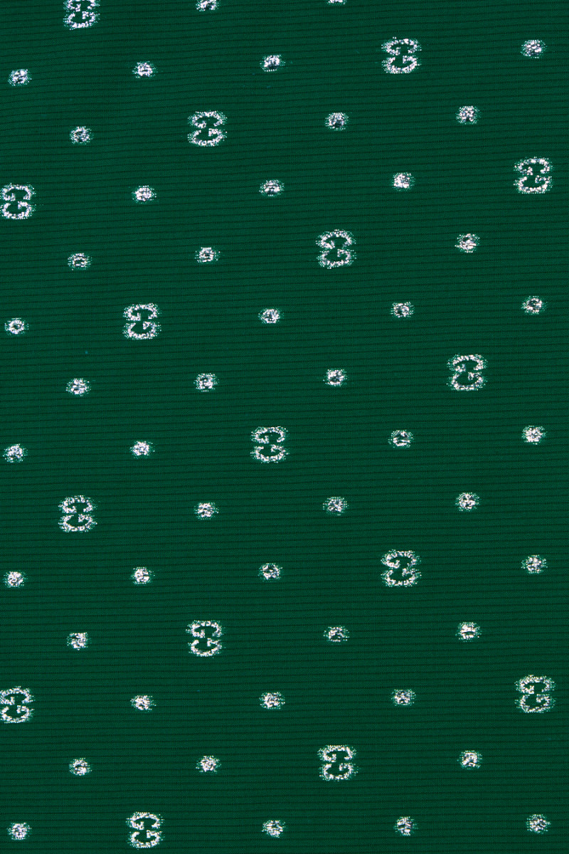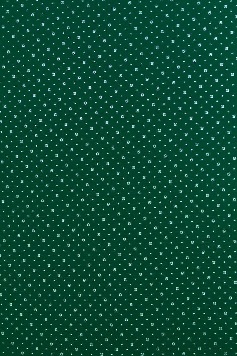 Košeľová látka v zelenej farbe s motívom malých, husto umiestnených pruhov. Celok je pravidelne zdobený bodkami a písmenami zo striebornej, lesklej nite. Látka je tenká, ale nepriehľadná, mäkká, neelastická a pochádza z kolekcie známeho módneho návrhára, vzhľadom na usporiadanie vzoru odporúčame obvodové šitie. Ideálna ponuka na košele, blúzky a ľahké šaty.