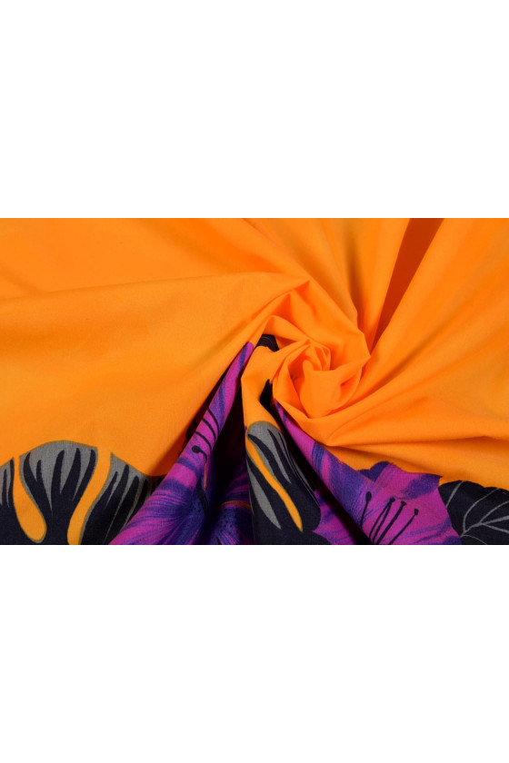 Talianska polyesterová tkanina v oranžovej farbe so zaujímavým mramorovaným oderom. Látka pozdĺž jedného okraja je ukončená kvetinovým okrajom v čiernej a fialovej farbe - šijeme ju po obvode.
