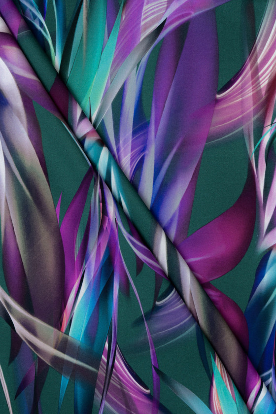 Taliansky hodvábny satén, elastický s motívom podlhovastých listov na tmavozelenom podklade. Husto vyrobený vzor v chrpe, fialovej, fuchsiovej a teal farbe dodáva látke krásny vzhľad - potlač je vyrobená na matnej strane.