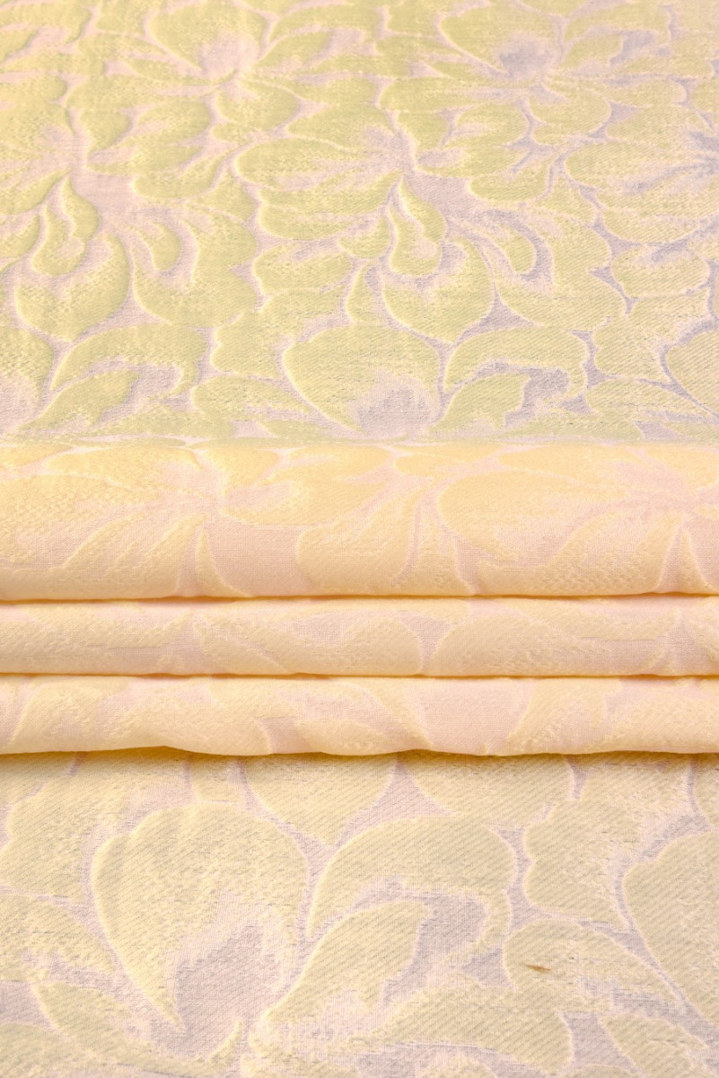 Vanilkový žakár s reliéfnym kvetinovým vzorom. Štruktúra látky je ideálna na šitie elegantných šiat a sukní. Môže byť tiež použitý ako dekoratívna tkanina.