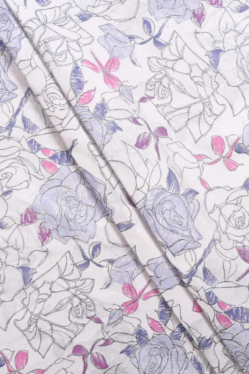 Talianska žakárová kostýmová látka vo svetlošedej. Materiál má veľmi originálny vzor načrtnutých ružových kvetov, náčrt je vyrobený zo šedej lesklej nite, ktorá mu dodáva eleganciu. Niektoré kvety majú fialovú výplň, navyše listy sú sfarbené do ružova, fialova a tmavomodra. Ľavá strana látky je tiež veľmi účinná a dá sa použiť. Materiál má pevnú väzbu, je nepružný a tuhý. Skvelý návrh na šitie kostýmu, šiat, sukne alebo na dekoratívne účely.