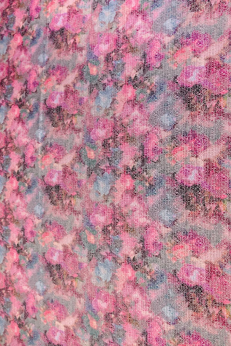 Talianska žakárová kostýmová látka s hustou, jasnou väzbou. Veľmi pôsobivý vzor veľkých, maľovaných kvetov. Dominantnými farbami sú tu fuchsiová a ružová s prvkami modrej, zelenej a bordovej. Skvelý návrh na šitie elegantného kostýmu, šiat, sukne. Látku je možné použiť aj na dekoráciu.