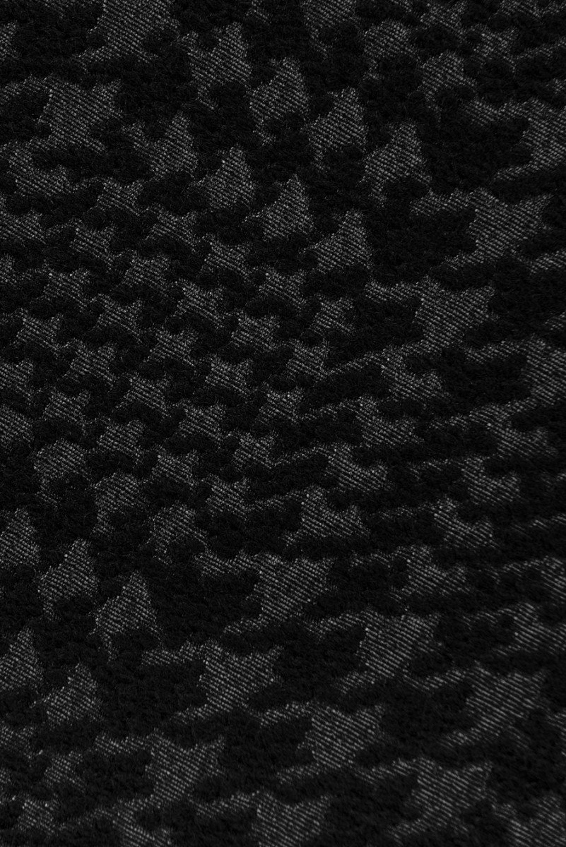 Talianska kostýmová látka v grafite a čiernej farbe s motívom kuracieho stehna, ktorý tvorí károvaný (asi 3 cm). Pozadie látky je matné a vyrobené z polyesteru, zatiaľ čo vzor je vyšívaný čiernou matnou vlnenou niťou a je mierne konvexný. Hrubšia látka ideálna na šitie kostýmu, bundy, sukne, šiat, tenkého kabáta alebo bundy.