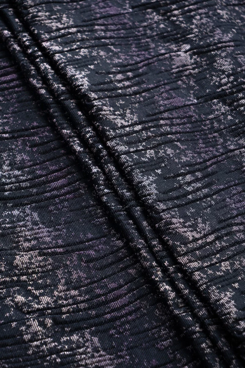Talianska žakárová tkanina v odtieňoch čiernej, fialovej a béžovej. Jemne elastická, lesklá tkanina so záhybovým efektom.