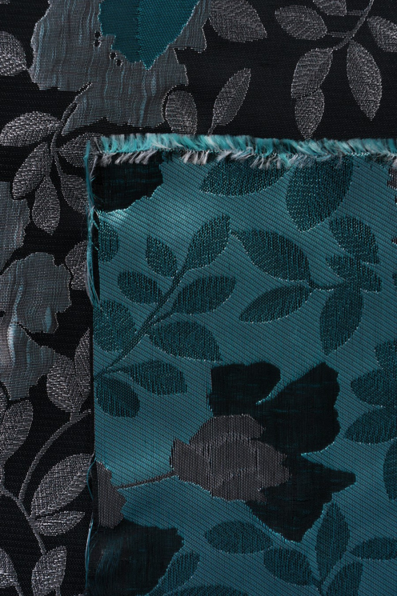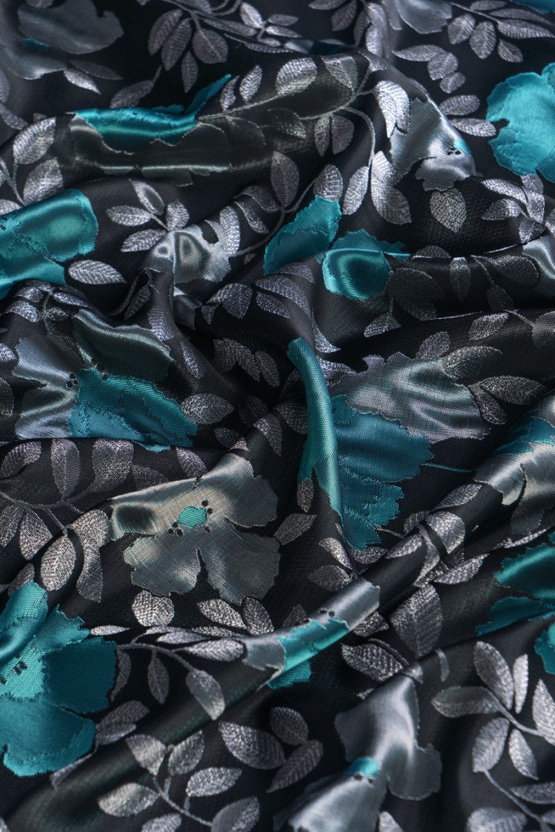 Talianska žakárová kostýmová látka s hustým kvetinovým motívom. Pozadie látky je tkané z dvoch farieb nití: čiernej a šedej nite jemne trčia zospodu, vďaka čomu má dvojfarebný efekt a trblieta sa v závislosti od uhla dopadu svetla. Kvetinový vzor je tkaný z lesklých nití: striebornej a tyrkysovej, je veľmi hustý a kvety sú veľké asi 10 cm. Látka je neelastická, mäkká - ideálna na šitie šiat, sukne alebo na dekoratívne účely.