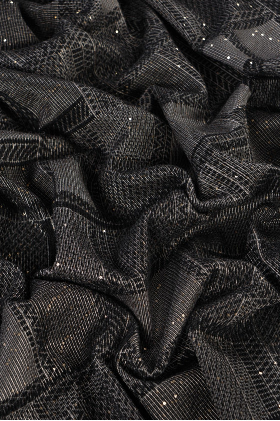 Originálna talianska tkanina tkaná pre známeho módneho návrhára v patchworkovom vzore grafitových, perleťových a ecru nití. Eleganciu dodávajú malé, zlaté flitre, ktoré sú do nej vtkané