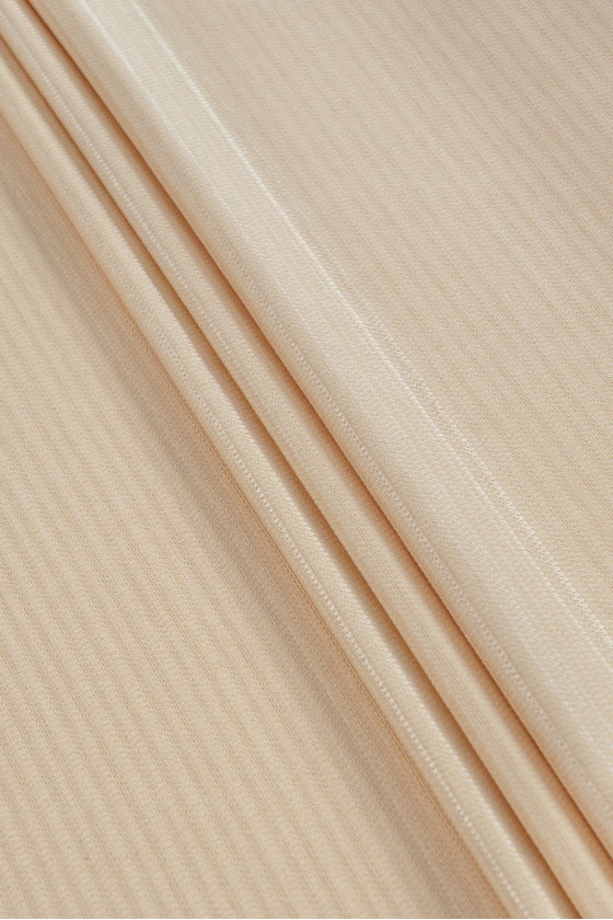 Talianska žakárová kostýmová tkanina tkaná z prírodnej vlny a prírodného hodvábu. Motív malých cikcakov vo svetlobéžovej farbe. Hrubšia, mäsitá tkanina - ideálna na šitie kostýmu, bundy, kabáta.