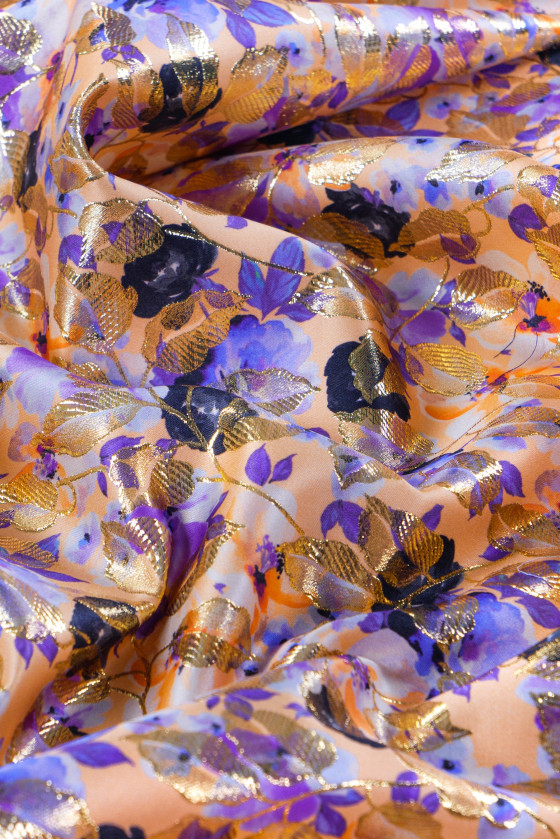 Talianska žakárová kostýmová látka s hladkou saténovou väzbou. Pozadie látky je vyrobené z marhule s hustým vzorom kvetov v rôznych odtieňoch fialovej od vresu až po tmavú, sýtu farbu. Okrem toho je vzor zdobený zlatými listami, ktoré sú vyrobené z lesklej nite. Tkanina je neelastická, tuhá, veľmi efektívna. Ideálne na šitie šiat, kostýmu, sukne, tenkého kabáta.