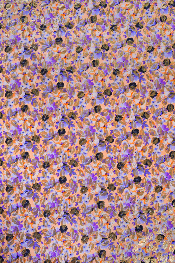 Talianska žakárová kostýmová tkanina v marhuľovej farbe s motívom fialových kvetov a zlatých listov. Tkanina je neelastická, tuhá, veľmi efektívna.