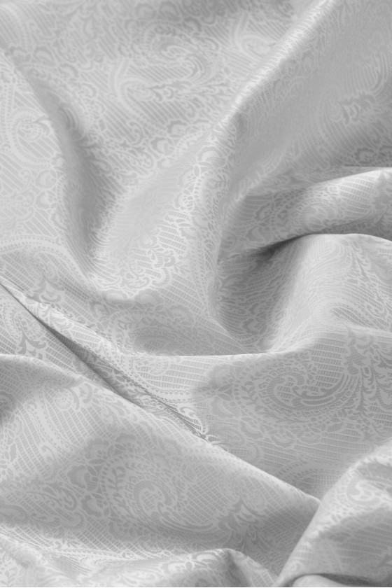 Talianska žakárová kostýmová látka s motívom Paisley v svetlošedej farbe. Tkanina je tenká, mierne tuhá, veľmi elastická.