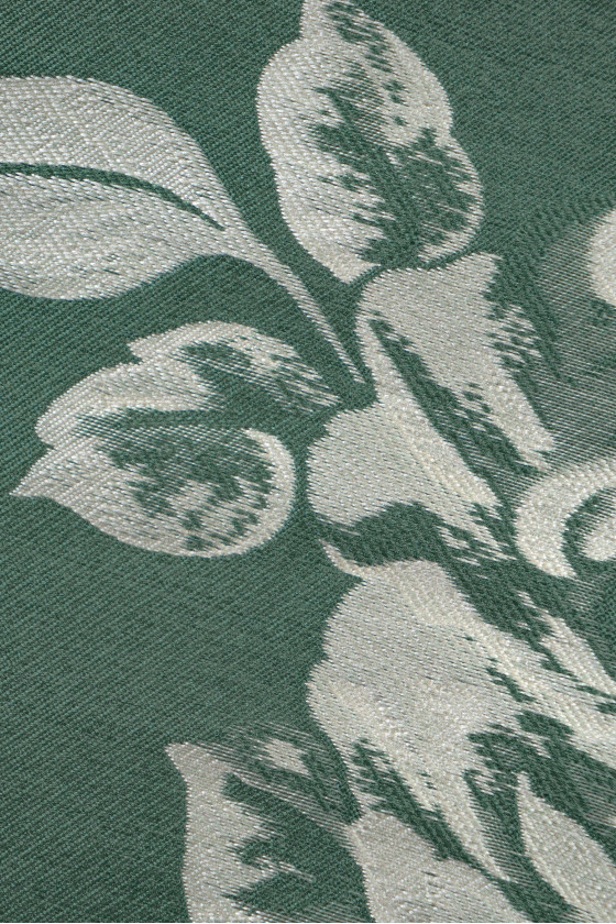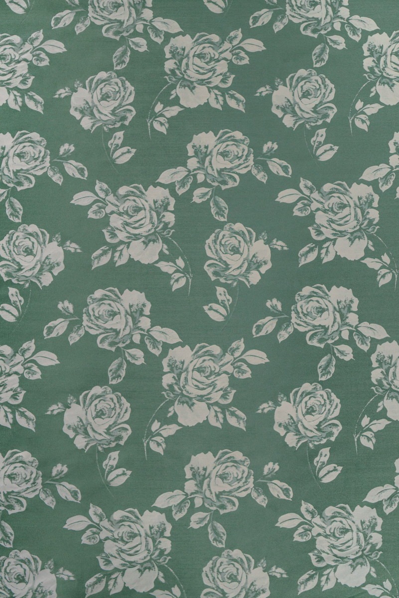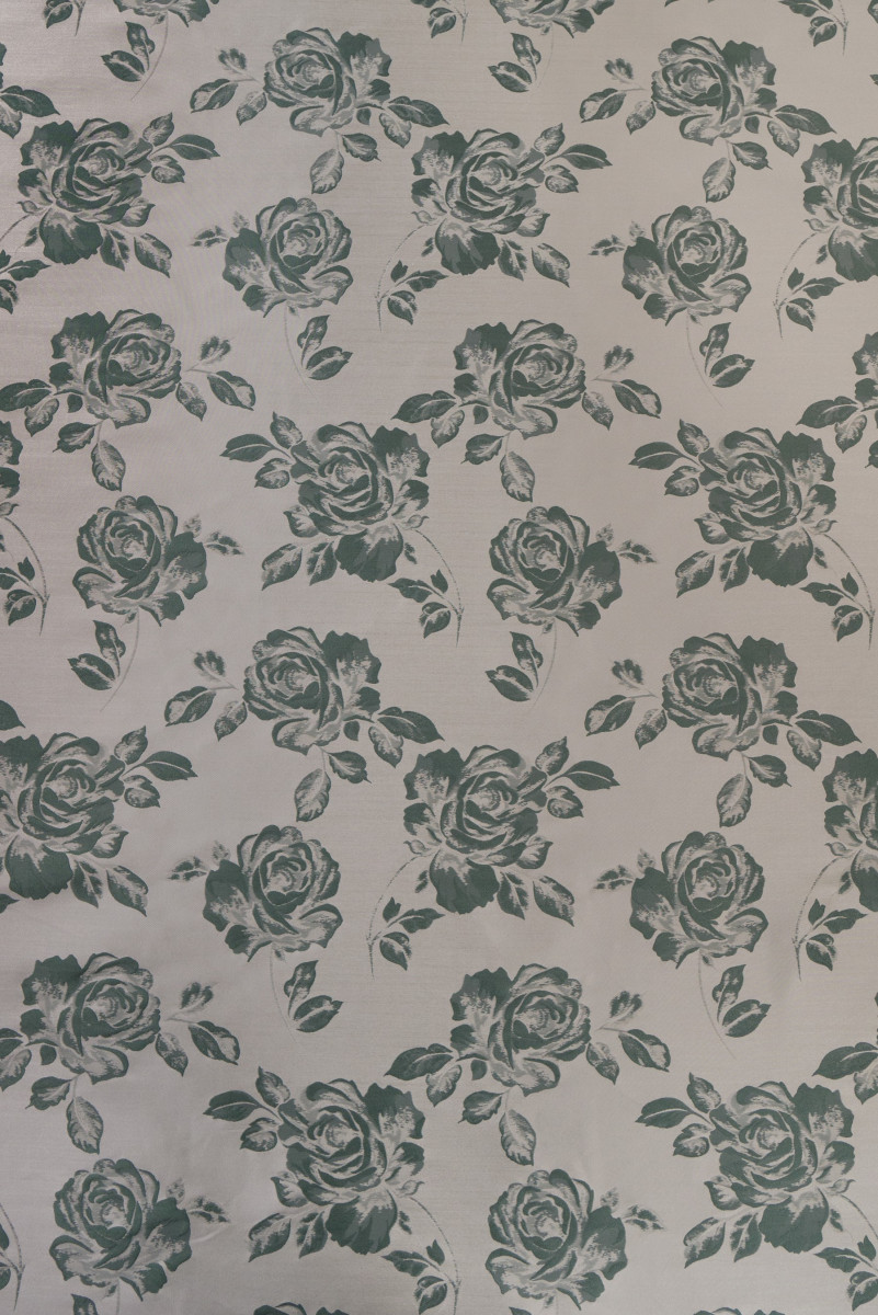 Talianska žakárová kostýmová látka s motívom ružového kvetu, veľká asi 30 cm. Látka je obojstranná: na jednej strane v tmavej mäte s ecru kvetmi a na druhej strane v ecru s tmavými mätovými kvetmi. Látka je hrubšia, tuhá, neelastická s charakteristickým leskom. Ideálne na šitie šiat, kostýmu, sukne alebo na dekoratívne účely.