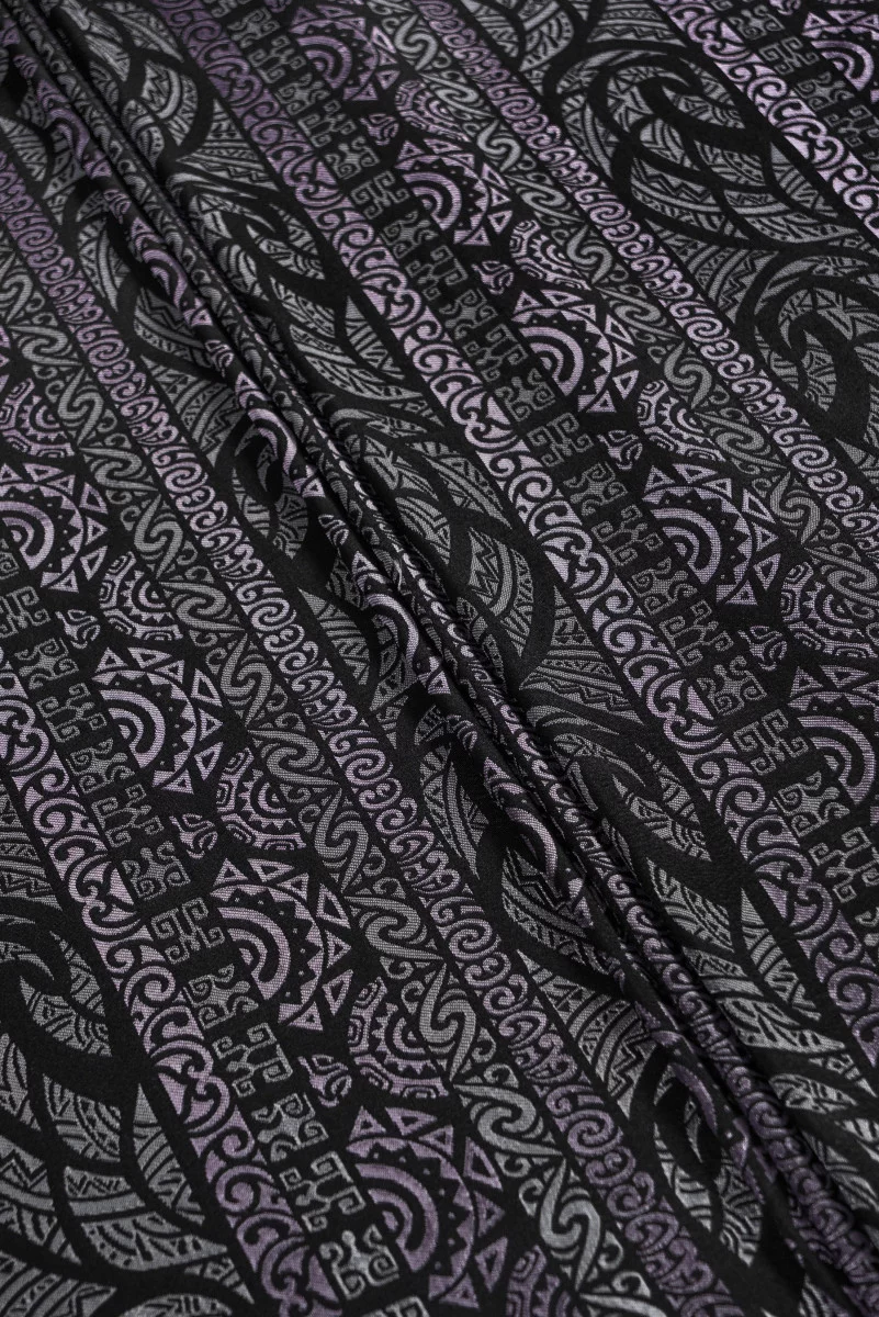 Talianska žakárová kostýmová látka s orientálnymi motívmi, ktoré tvoria vodorovné pruhy široké 12 cm. Krásna kombinácia čiernej, šedej a špinavo fialovej. Pozadie látky je matné a vzor je mierne lesklý. Látka je hrubšia, tuhá, neelastická s charakteristickým leskom. Ideálne na šitie šiat, kostýmu, sukne alebo na dekoratívne účely.
