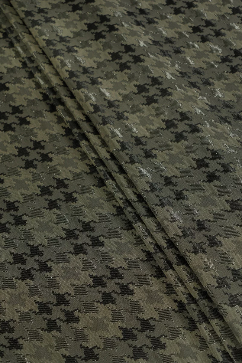 Talianska žakárová kostýmová látka so šedo-olivovým motívom kuracej nohy, látka je krásne zdobená lurexovou niťou.