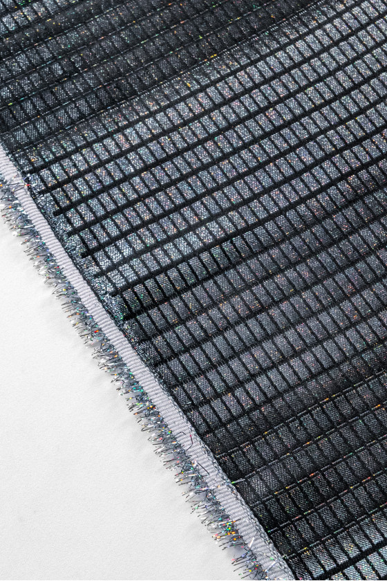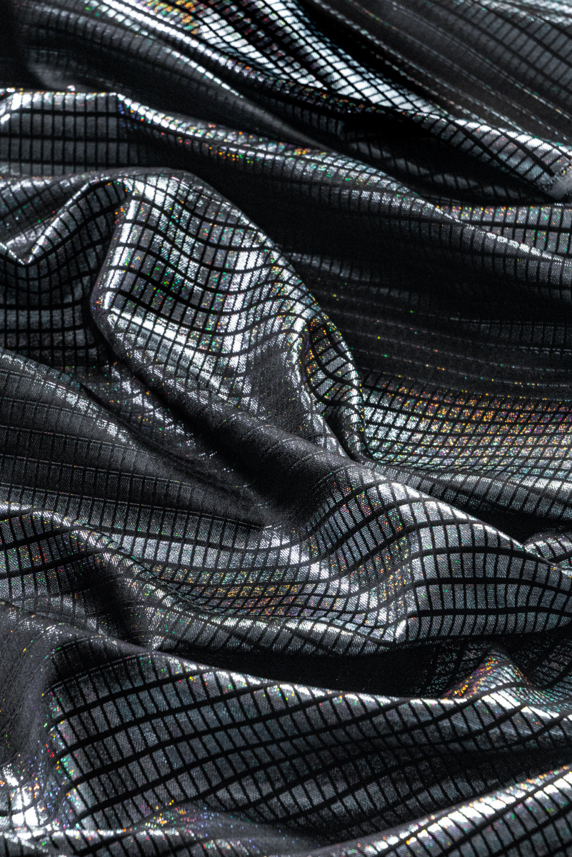 Talianska žakárová kostýmová látka v čiernej farbe s tieňovaným károvaným motívom, ktorý vytvára zvislé pruhy. Látka je tenká, ale nepriehľadná, mäkká, krásne zdobená lurexovou niťou vo viacerých farbách. Ideálne na šitie večerných šiat, blúzky alebo kostýmu.