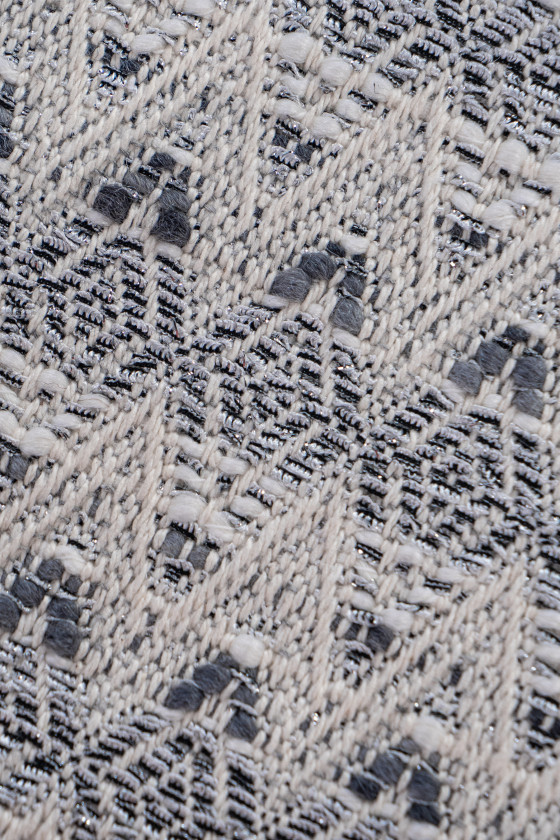 Talianska žakárová kostýmová látka v sivej a écru s motívom malých diamantov usporiadaných do vodorovných pruhov. Látka je hrubšia, tuhá, tkaná látka chanel. Ideálne na šitie kostýmu, bundy, tenkého kabáta.