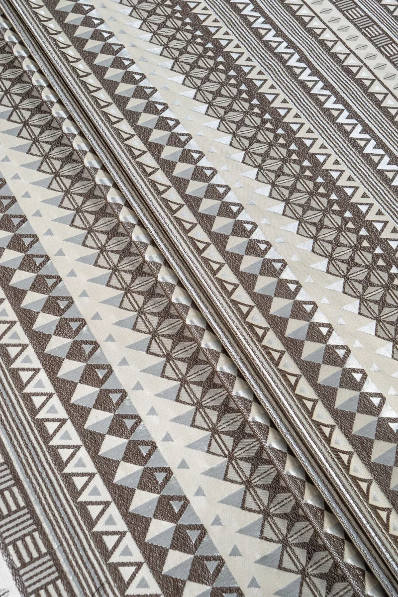 Talianska žakárová kostýmová tkanina s malými geometrickými vzormi v béžovej a hnedej farbe, zdobená striebornou lurexovou niťou. Tkanina je tenšia, mierne tuhá.