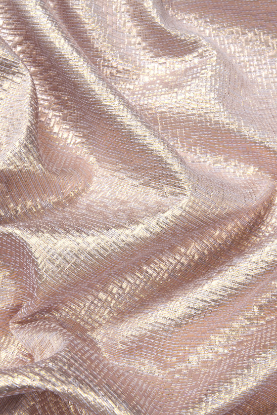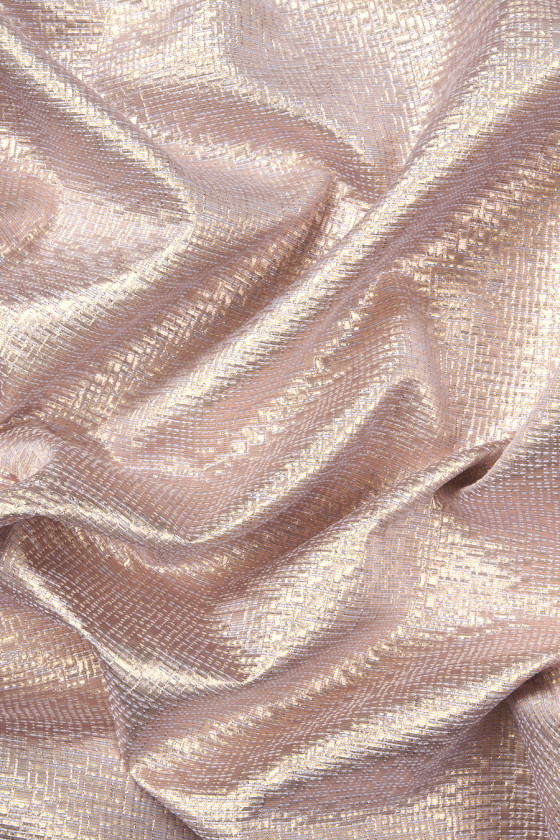 Talianska žakárová kostýmová tkanina vo fialovej a zlatej farbe s motívom malého, nepravidelného károvania. Stredne hrubá, neelastická tkanina s lurexovou niťou.