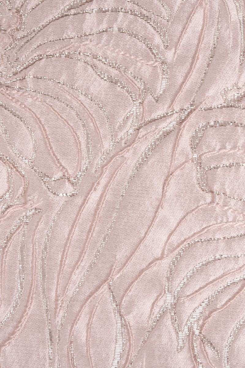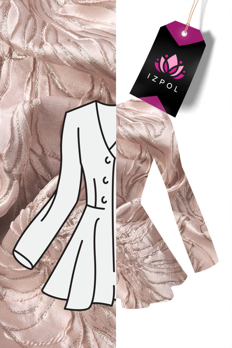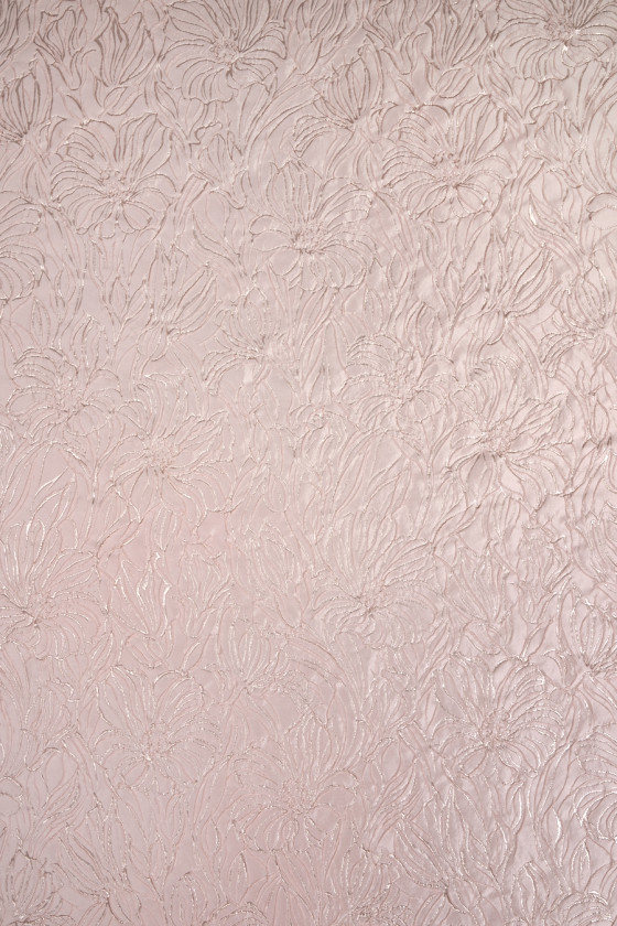 Talianska žakárová kostýmová tkanina z práškovej platiny s motívom veľkých, mierne vypuklých kvetov. Stredne hrubá, neelastická, tuhá tkanina.