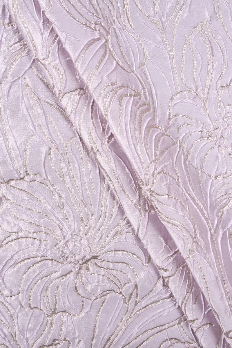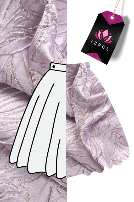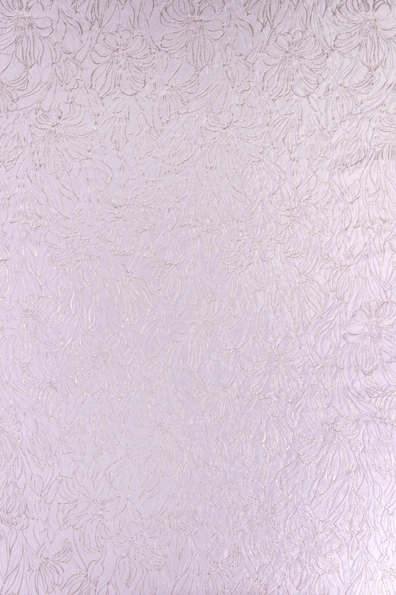 Talianska žakárová kostýmová tkanina vo fialovej a platinovej farbe s motívom veľkých, mierne vypuklých kvetov. Stredne hrubá, neelastická, tuhá tkanina.