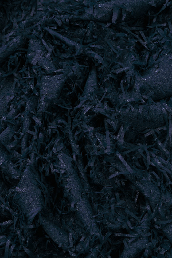 Talianska žakárová kostýmová látka v tmavomodrej farbe, nepravidelne zdobená 8 cm dlhými strapcami. Stredne hrubá tkanina, neelastická, mierne tuhá. Ideálne na šitie kostýmu, šiat, sukne, saka alebo na dekoratívne účely.