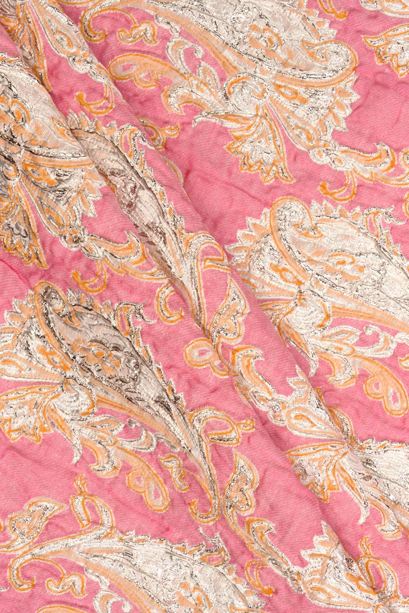 Talianska žakárová kostýmová tkanina v ružovej farbe s hustým motívom orientálnych vzorov Paisley v platine s oranžovým okrajom. Tkanina je mierne tuhá a má pokrčenú, konvexnú štruktúru. Veľmi cool, jarný návrh na šitie elegantných šiat, sukne alebo kostýmu.