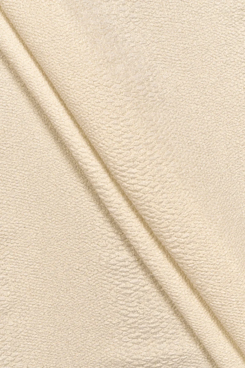Talianska žakárová tkanina v krémovej farbe, husto zdobená zlatou, lesklou niťou. Tkanina je mäkká, ľahká, s konvexnou štruktúrou, ktorá pripomína hadiu kožu, pružná po celej dĺžke látky. Krásny návrh na šitie šiat, sukne a saka na špeciálne príležitosti.