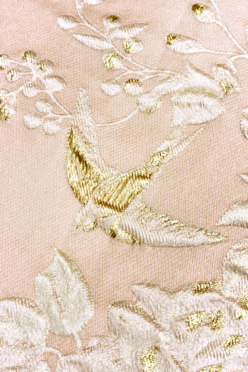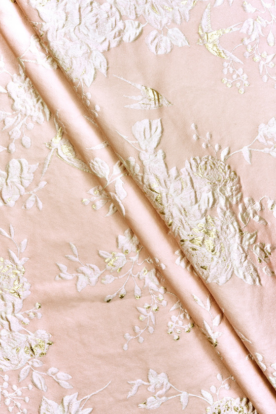 Talianska žakárová tkanina v lososovo ružovej farbe s kvetinovým motívom v krémovej farbe. Hustý vzor ružových kvetov rôznych veľkostí a malých lastovičiek, všetky čiastočne zdobené zlatou niťou. Tkanina je mäsitá, neelastická, nepriehľadná a mierne tuhá. Krásny návrh, z ktorého môžete vytvoriť jedinečnú sukňu, šaty, svetlý kabát alebo ho dokonca použiť na dekoratívne účely.